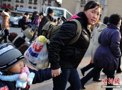 1月22日,在中國鐵路春運大潮中,一名婦女在北京站攜子匆匆買站臺票準備乘列車回家過年。中新社記者 鄒憲 攝