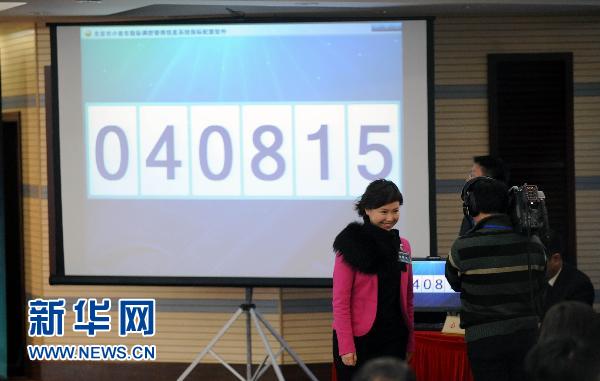 1月26日,搖號現場的投影屏幕上顯示由6人抽取的“種子數”。 當日上午,北京首輪機動車購車搖號落定,1.76萬名申購者成為幸運兒,在18.7萬人的競爭中獲得了購車指標。此舉標志著北京進入“購車搖號時代”,今后每一名購車者都需經過搖號大關。 新華社記者 李文 攝