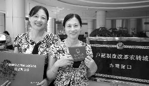 2010年8月4日,重慶永川區戶籍制度改革轉城鎮居民首發儀式上,周倫菊姐妹領到城鎮居民戶口。資料圖片