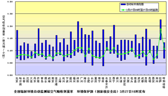 上圖是環境保護部(國家核安全局)3月27日18時繼續發布的全國省會城市和部分地級市輻射環境自動監測站實時連續空氣吸收劑量率監測值。監測結果匯總圖中綠色曲線代表監測值,藍色柱體代表天然本底水平,綠色曲線均在藍色柱體范圍內。監測結果表明,目前我國環境輻射水平仍在本底范圍內,日本核電事故未對我國環境及境內公眾健康產生影響。
