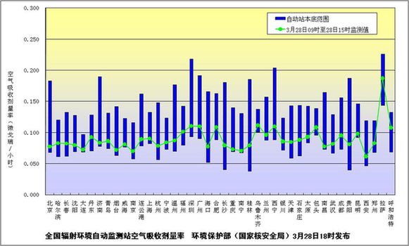 圖是環境保護部(國家核安全局)3月28日18時繼續發布的全國省會城市和部分地級市輻射環境自動監測站實時連續空氣吸收劑量率監測值。監測結果匯總圖中綠色曲線代表監測值,藍色柱體代表天然本底水平,綠色曲線均在藍色柱體范圍內。監測結果表明,目前我國環境輻射水平仍在本底范圍內,日本核電事故未對我國環境及境內公眾健康產生影響。