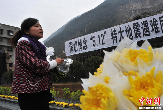 清明節將近,又度使三年前被大地震毀城的四川省北川羌族自治縣縣城廢墟悲情籠罩,一位少女懷抱特別培植的春菊,前來公墓憑吊。中新社發 賈國榮 攝