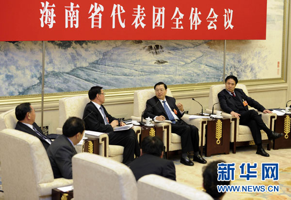 3月11日,中共中央政治局常委、國務院副總理張德江參加十二屆全國人大一次會議海南代表團的審議。 新華社記者謝環馳攝
