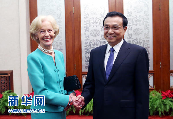 李克強說,習近平主席同你舉行了富有成果的會談。今年4月,中澳建立戰略伙伴關系和總理年度會晤機制,成為兩國關系新的里程碑。希望雙方尊重彼此核心利益和重大關切,加強在貿易投資、能源資源、教育人文等領域交流與合作,推動中澳關系在新的起點上取得更大發展。