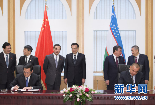 11月29日,中國國務院總理李克強在塔什干與烏茲別克斯坦總理米爾濟約耶夫共同出席雙邊經貿、能源、文化等合作文件的簽字儀式。新華社記者李學仁攝