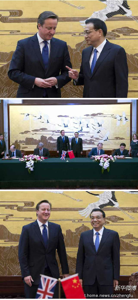 國務院總理李克強2日上午與英國首相卡梅倫舉行會談后,共同見證了兩國投資、科技創新、金融、司法、文化、衛生等領域10個合作文件的簽署。
