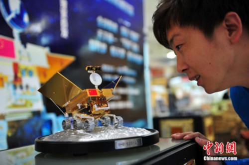 12月15日,在沈陽一商場內(nèi)展示了中國月球車1:12模型“玉兔”號(hào),并引起市民購買熱潮。當(dāng)日4時(shí)35分,嫦娥三號(hào)著陸器與巡視器分離,“玉兔號(hào)”巡視器順利駛抵月球表面。中新社發(fā) 于海洋 攝