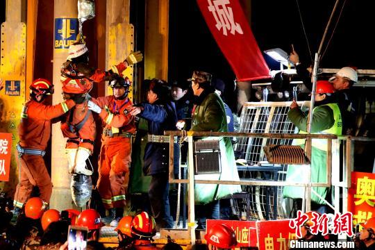 1月29日晚20時,守候在救援現場4天的中新網記者看到,來自醫療衛生、通信、消防、公安、武警各個部門的千余名救援人員冒著零下6℃的嚴寒,已經集結在救援現場,做好了救援準備。20時40分,地面救援人員采用救援帶將升井使用的護膝、鋼盔等物品沿著大口徑救援孔慢慢向深處下放。21時06分,記者聽到救援人員兩聲哨響,起重機械開始一厘米一厘米非常緩慢地向上提拉救援繩。