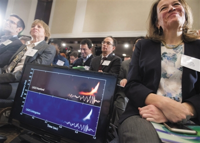 在美國首都華盛頓舉行的新聞發(fā)布會上,屏幕上顯示出探測到的引力波。圖/CFP