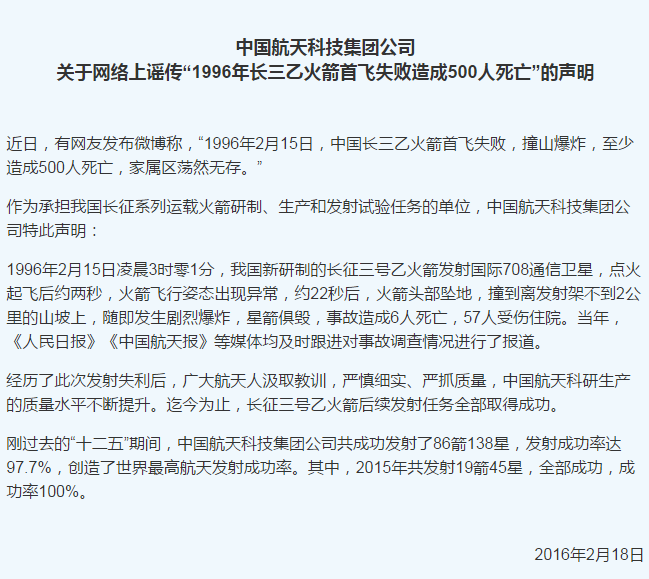 中國航天科技集團公司關于網絡上謠傳“1996年長三乙火箭首飛失敗造成500人死亡”的聲明