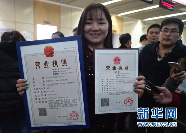 江西國道貴金屬貿易有限公司法定代表人李霞在展示她領到的南昌市首張“三證合一”營業執照和副本(2015年3月26日攝)。兩年多來,中央全面深化改革領導小組確定的181個重點改革任務基本完成,中央有關部門完成261個改革任務,各方面共出臺改革成果785項。隨著一項項改革措施密集出臺,全面深化改革潮掀浪涌,奏出推動經濟社會發展的時代強音。 新華社記者 陳子夏 攝