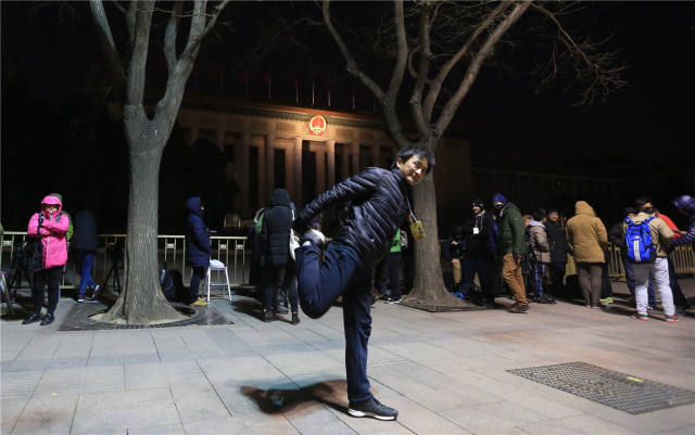 3月5日早6時許,一位在人民大會堂外排隊的記者活動身體。新華社記者 邢廣利 攝