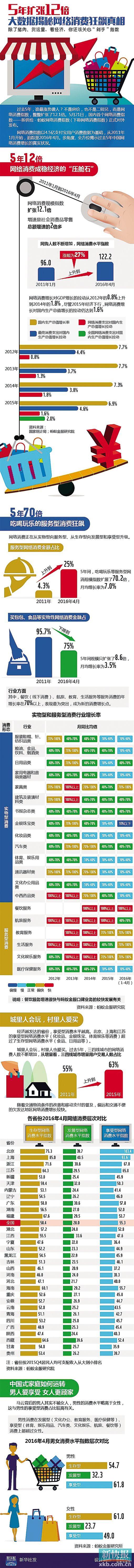 數據顯示,過去五年,網絡消費規模指數擴張12.1倍,增速為社會消費品零售總額增速的2倍多;網絡消費水平指數從2011年1月的96.0上升到2016年4月的122.2,漲幅為27.2%。