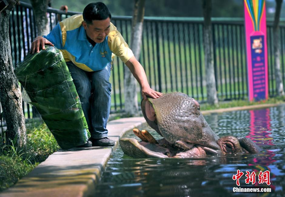 每到端午,家家戶戶忙著買(mǎi)粽葉、包粽子,一時(shí)間粽葉幽青、糯米飄香。端午節(jié),重慶永川一野生動(dòng)物園的動(dòng)物們也嘗到了粽子的美味。圖為為了給河馬吃上粽子,飼養(yǎng)員費(fèi)盡了心思。這只巨粽,用了一斤多粽葉。鐘欣 攝