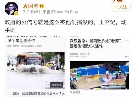 其中最典型的就是下圖中這位@袁國(guó)寶 了。他發(fā)帖說(shuō),2013年武漢宣稱投資130億3年改善排水系統(tǒng),稱能抵御相當(dāng)于15個(gè)東湖的雨量,但如今看來(lái)應(yīng)該讓王岐山去武漢調(diào)查這“打了水漂”的130億了。