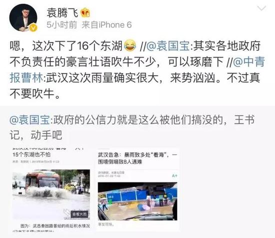 他還說(shuō)當(dāng)?shù)卣辉摯蹬#瑩p害公信力。而他的這些言論也很快被知名歷史“發(fā)明家”@袁騰飛 等各路大V轉(zhuǎn)發(fā),其中袁騰飛挖苦說(shuō):因?yàn)檫@次下了16個(gè)東湖...