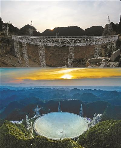 位于貴州黔南州平塘縣大窩凼的世界最大單口徑射電望遠鏡——500米口徑球面射電望遠鏡(FAST)的最后一塊反射面單元3日成功吊裝,這標志著FAST主體工程順利完工。這只“觀天巨眼”預計于今年9月全部竣工,開始探索宇宙深處的奧秘。據介紹,FAST突破了射電望遠鏡的百米極限,它擁有30個足球場大的接收面積,與號稱“地面最大的機器”的德國波恩100米望遠鏡相比,靈敏度提高約10倍。它將在未來10至20年保持世界一流設備的地位。