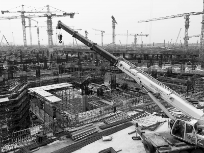 在現場指揮的帶領下,記者爬上鏤空的瞭望臺,工地景象盡收眼底:27根黃色塔吊凌空站立,俯視著從地面探出約一層樓高的鋼筑結構,戴著黃色安全帽的工人們散布在各處“鋼筋籠子”中,那“叮叮當當”的聲響便是出自他們之手。如果把航站樓比做一個巨人,很明顯,現在工人們正在搭建這位巨人的堅硬“骨骼”。