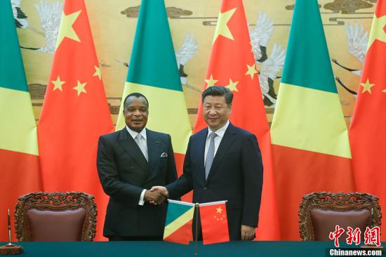 7月5日,中國國家主席習近平在北京人民大會堂與剛果共和國總統薩蘇舉行會談。會談后,兩國元首共同見證了外交、產能、經濟技術、農業、文化、基礎設施、金融及地方交流等領域雙邊合作文件的簽署。中新社記者 盛佳鵬 攝