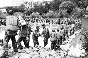 7月5日,湖北某預(yù)備役高炮師官兵在傳遞袋裝石料,用于管涌處置圍堰修筑。新華社發(fā)