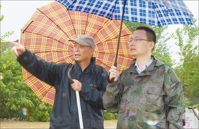 7月1日,安徽含山縣環峰鎮三龍村黨總支書記尹建平(左)在察看汛情。