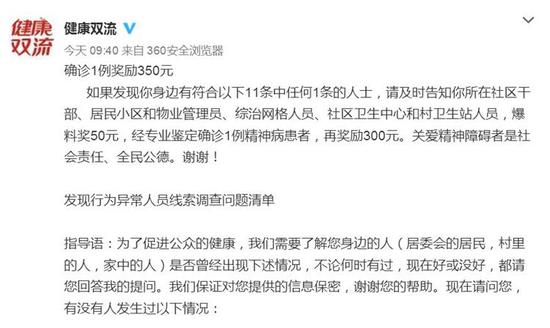 換句話說,發(fā)現(xiàn)并確診1例精神病患者,將得到線索獎勵350元。