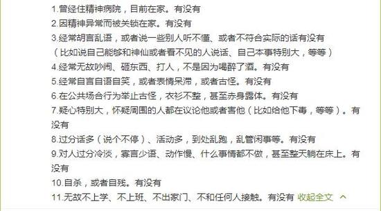 所謂的11條,即判斷對方是否曾經(jīng)有下述11種情況出現(xiàn):曾經(jīng)住精神病院,目前在家;因精神異常而被關(guān)鎖在家;經(jīng)常胡言亂語,或者說一些別人聽不 懂、或者不符合實際的話(比如說自己能夠和神仙或者看不見的人說話、自己本事特別大,等等);經(jīng)常無故吵鬧、砸東西、打人,不是因為喝醉了酒;經(jīng)常自言自 語自笑,或者表情呆滯,或者古怪;在公共場合行為舉止古怪,衣衫不整,甚至赤身露體有沒有;疑心特別大,懷疑周圍的人都在議論他或者害他(比如給他下毒, 等等);過分話多(說個不停)、活動多,到處亂跑,亂管閑事等;對人過分冷淡,寡言少語、動作慢、什么事情都不做,甚至整天躺在床上;自殺,或者自殘;無 故不上學(xué)、不上班、不出家門、不和任何人接觸。