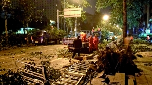 昨天凌晨零點左右,北京晨報記者到達日壇路南口。只見一排高大的楊樹都已經倒地,其中大部分都是連根拔起,楊樹的樹干已經砸在了主路上。記者看到,幾名身穿橘色工作服的園林部門工作人員先將樹干鋸斷,再分次裝上車子拉走。此外,一輛停放在樹下的灰色轎車被倒地的大樹砸到了車頂。車子的頂部已經凹了進去,左側兩個車門已經無法關閉,擋風玻璃也已經破碎。
