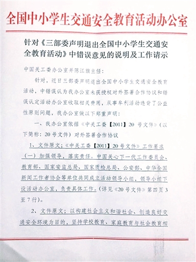 這份名為“針對《三部委聲明退出全國中小學(xué)生交通安全教育活動》中錯誤意見的說明及工作請示”中,首先回應(yīng)了“未獲三部委授權(quán)”的質(zhì)疑,稱安全教育辦公室是依據(jù)中國關(guān)工委[2011]20號文件對外簽署的協(xié)議,“按照指導(dǎo)思想聯(lián)合社會各界共同開展學(xué)生教育工作,為明確合作雙方的責(zé)、權(quán)、利,必然要簽署合作協(xié)議。”