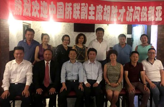 代表團(tuán)團(tuán)長(zhǎng)、中國(guó)僑聯(lián)副主席胡勝才和出席座談的部分僑領(lǐng)合影。