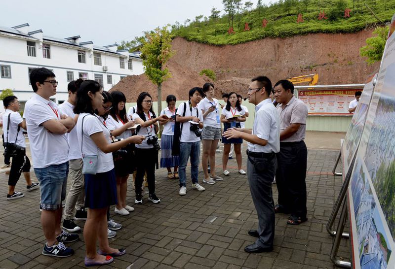 采訪團在羅坳鎮(zhèn)大橋移民新村采訪。江西畫報劉志強 攝