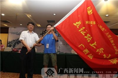 自治區(qū)網(wǎng)信辦主任金化倫向參加長征行的媒體記者代表授旗。 廣西新聞網(wǎng)記者 鄧昶 攝