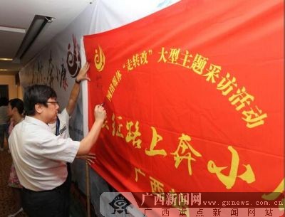 參加長征路上奔小康采訪的領(lǐng)導(dǎo)、媒體記者們在活動旗幟上簽名。 廣西新聞網(wǎng)記者 鄧昶 攝