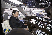 2014年5月23日,習(xí)近平在上海考察期間,在中國(guó)商飛設(shè)計(jì)研發(fā)中心C919大型客機(jī)展示樣機(jī)駕駛室察看,了解速度表、高度表、航跡圖等有關(guān)儀器儀表情況。