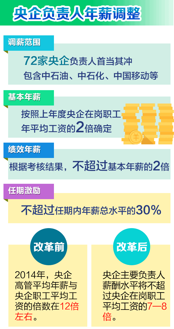 改革后,據人社部透露,從2015年1月開始,央企已全部按要求調整了企業負責人的基本年薪標準。多數中央管理企業負責人的薪酬水平下降,有的下降幅度還比較大。
