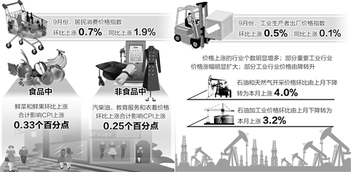 9月份CPI同比上漲1.9%,雖連續4個月處于“1時代”,但已比上月同比漲幅提高0.6個百分點,是連續4個月下降后的首次上漲。業內專家預計,四季度物價或小幅抬升,但幅度有限。同時,PPI同比上漲0.1%,4年半來首次由負轉正——