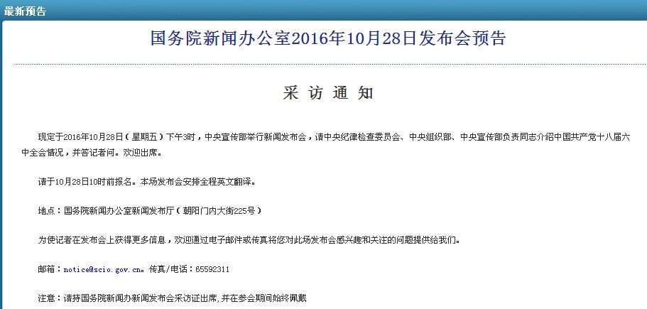 【環球網綜合報道】國新辦網站10月27日發布預告,定于2016年10月28日(星期五)下午3時,中央宣傳部舉行新聞發布會,請中央紀律檢查委員會、中央組織部、中央宣傳部負責同志介紹中國共產黨十八屆六中全會情況,并答記者問。