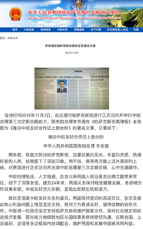 【李克強在哈最大報紙發表署名文章】在訪問哈薩克斯坦當天,李克強在哈最大報紙《哈薩克斯坦真理報》發表署名文章表示,產能合作是中哈合作中的一大亮點和重要增長點,中方愿與哈方一道,本著開放、協商合作、互利共贏的原則,用實實在在的合作成果惠及兩國人民,共同推動中哈友好合作不斷邁上新臺階。