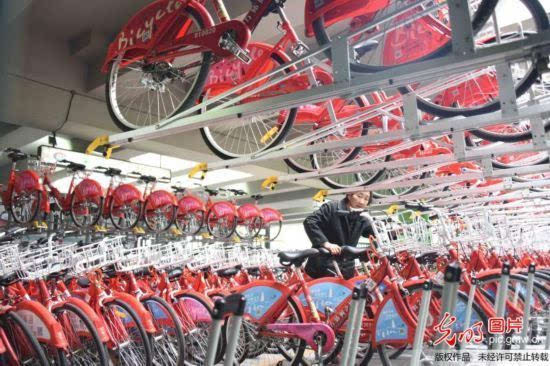 當日,杭州首個公共自行車立體停車裝置在位于杭州東站東廣場下的公共自行車閘機式服務點投入試用。該裝置分上下兩層,由一排豎立支架和數十個可滑動的獨立停車托架組成,將自行車推入托架后即可輕松地移送至上層停放,上層停滿后再停放下層,同樣的占地面積能提高一倍的儲車量,有效緩解人們租不到車或停不進車的尷尬,特別適合設置在人流密集、租車需求量較大的地段。(朱引煒攝/光明圖片)