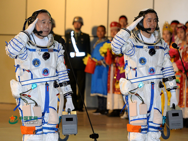 航天員景海鵬(左)、陳冬在出征儀式上敬禮。中國軍網記者 岱天榮攝