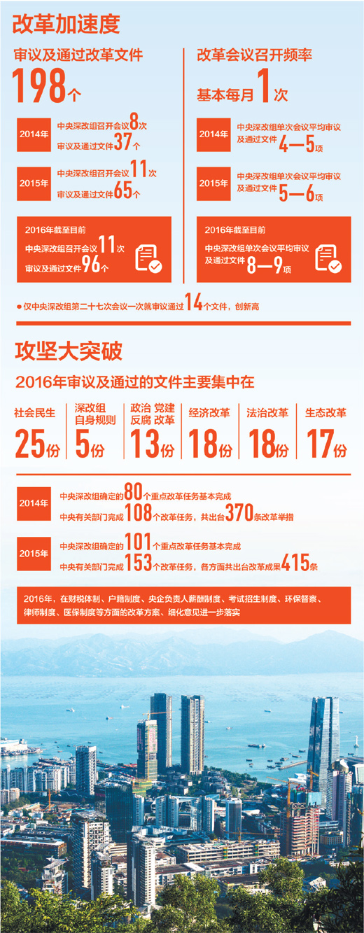“如果把全面深化改革比作建造大廈的話,這三年是夯基壘臺、選材備料、立柱架梁的三年,今年力爭把主體框架搭建起來。”2016年,全面深化改革的“四梁八柱”拔地而起。