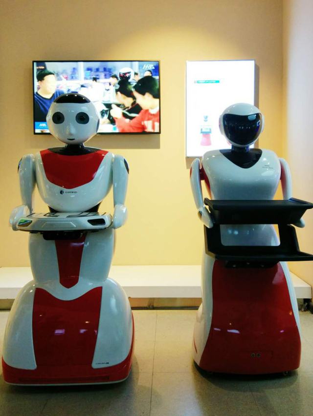 這兩款是餐飲機器人,外形小巧圓潤,笑容憨態可掬,既可以點菜和送餐,還具有重力感應、自動避障、語音對話等功能。在餐廳遇到這樣的服務員,一定是場新奇的用餐體驗。
