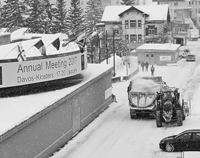 2017年達(dá)沃斯論壇在即,圖為工人們正在清掃論壇會場附近的積雪。劉軍攝/光明圖片