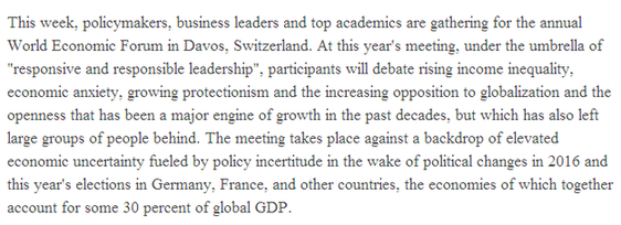 全球化與開放在過去幾十年里是拉動經濟增長的主要引擎,但也有大批民眾落伍。本屆論壇召開的背景是2016年政壇變動后政策不確定和今年德國、法國及其他國家即將迎來大選導致經濟不確定性上升,這些國家的經濟總量占全球GDP的30%左右。