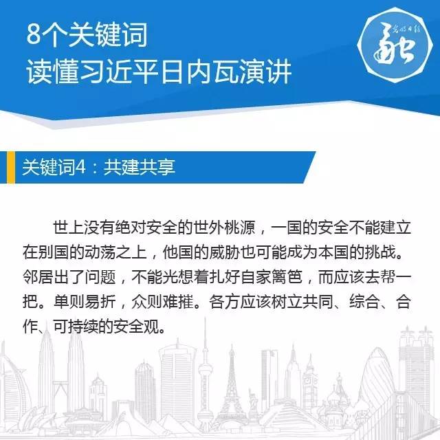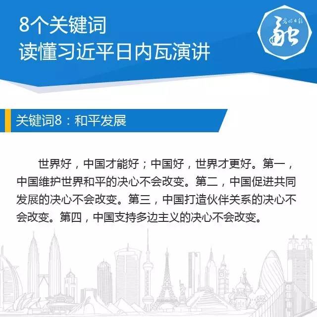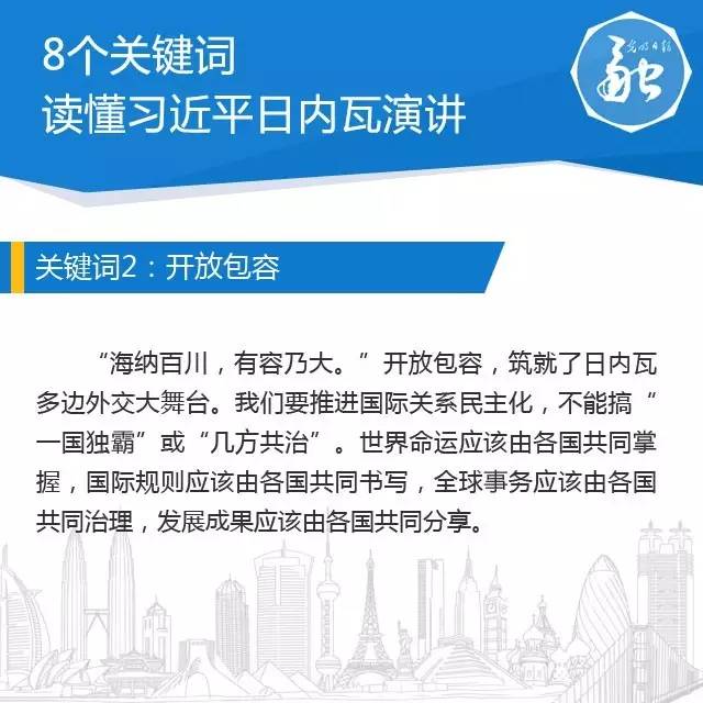 1月18日,國家主席習近平在瑞士日內瓦萬國宮出席“共商共筑人類命運共同體”高級別會議,并發表題為《共同構建人類命運共同體》的主旨演講。習近平在演講中提到:“對中國來講,日內瓦具有一份特殊的記憶和情感。1954年,周恩來總理率團出席日內瓦會議,同蘇聯、美國、英國、法國等共同討論政治解決朝鮮問題和印度支那停戰問題,展現和平精神,為世界和平貢獻了中國智慧。”今天,小編帶你用8個關鍵詞,讀懂習近平日內瓦演講。