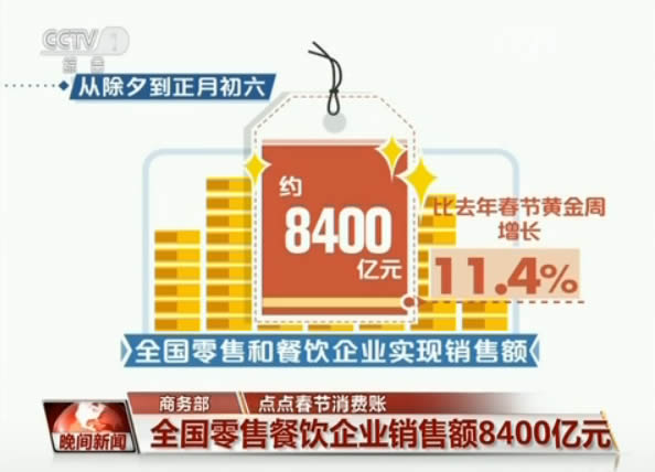 商務部公布的最新數據顯示:從除夕到正月初六,全國零售和餐飲企業實現銷售額約8400億元,比去年春節黃金周增長11.4%。