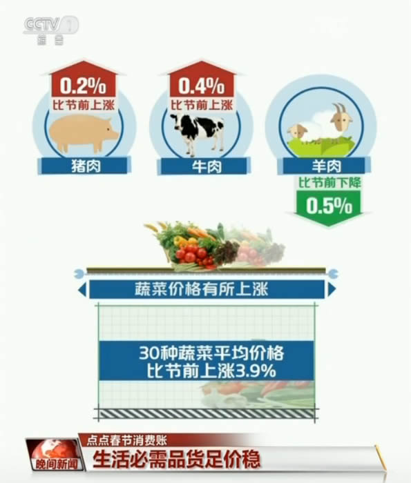 春節期間,各地的生活必需品市場供應充足、品種豐富、價格總體平穩。糧食價格略有上漲,肉類價格小幅波動,蔬菜價格有所上漲,30種蔬菜平均價格比節前上漲3.9%。