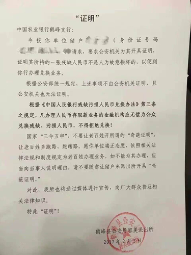 難能可貴的是,鶴峰縣公安局容美派出所并沒有一拒了之,而是以開“證明”的形式,讓這位儲戶給銀行帶話,指出“上述事項不由公安機關證明,且公安機關也無法證明。”“根據《中國人民銀行殘缺污損人民幣兌換辦法》第三條之規定,凡辦理人民幣存取款業務的金融機構應無償為公眾兌換殘缺、污損人民幣,不得拒絕兌換。”