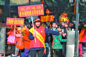 大年初一,海幢寺,志愿者舉牌提醒市民文明進香。廣州日報全媒體記者蘇俊杰攝