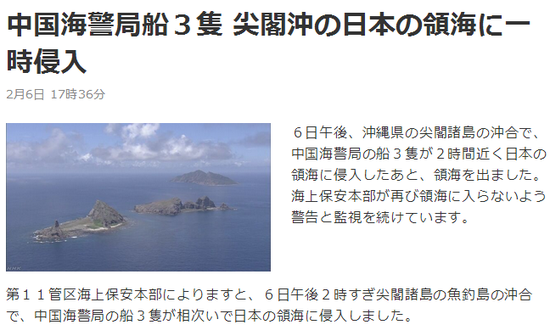 日本海上保安本部6日也發布了該消息。據日本NHK報道,中國海警船從6日下午2時進入釣魚島領海。還有媒體稱,3艘中國海警船中的1艘還搭載有“疑似機關炮”的裝置。日本時事通訊社稱,這是中國海警船2017年來第4次進入釣魚島領海。